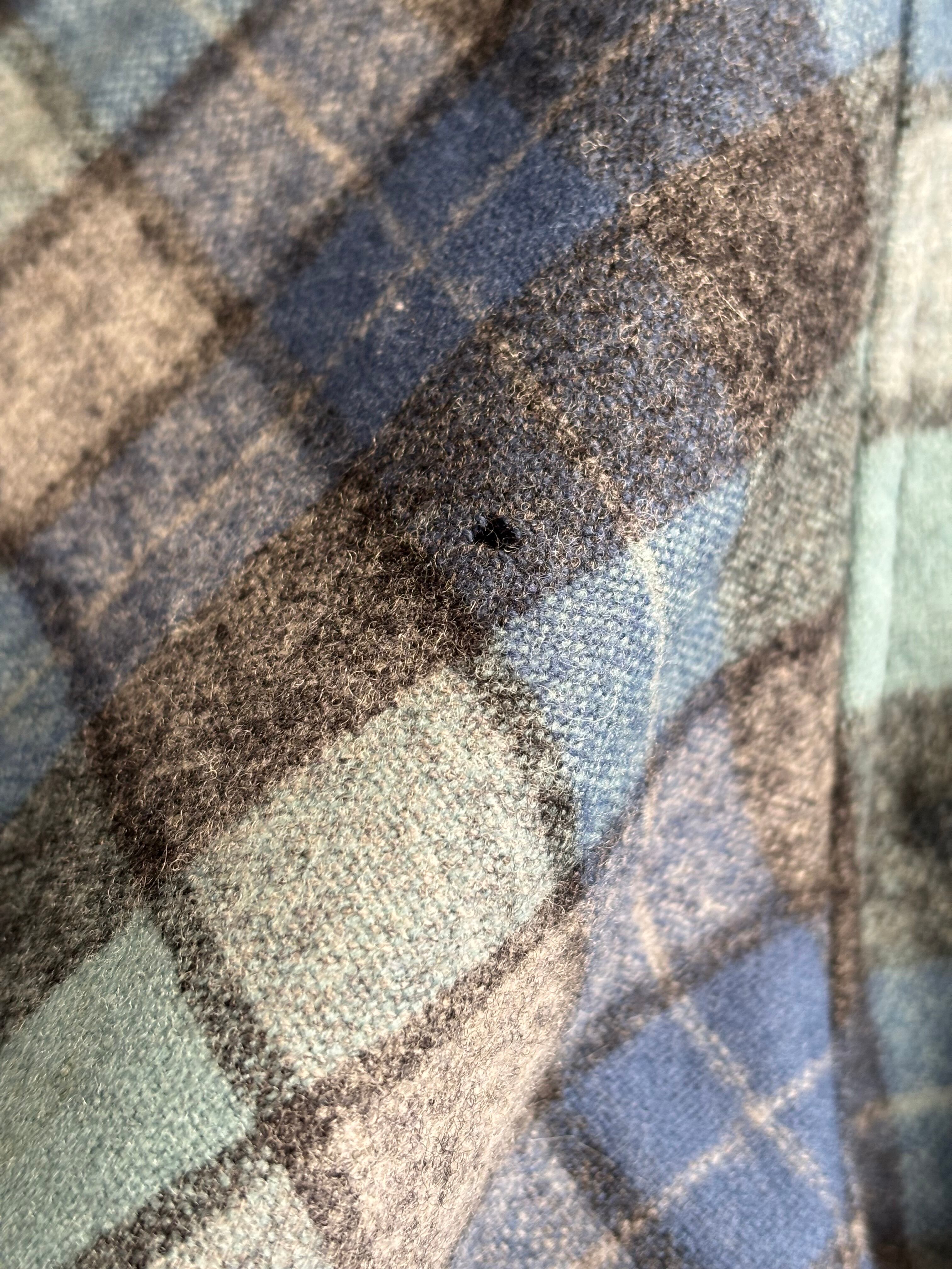 右袖部分と、後ろ右肩付近に小穴がございますが、着用時目立たない程度かと思います。